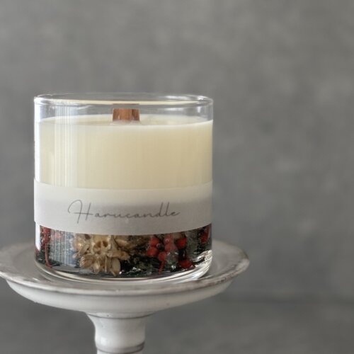 グラスに敷き詰めたクリスマスの花材をジェルで固めたら、お好きな天然のアロマオイルで香りを付けたソイワックスを流し込みます。