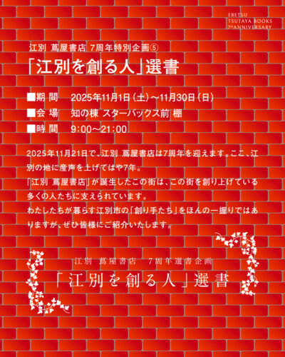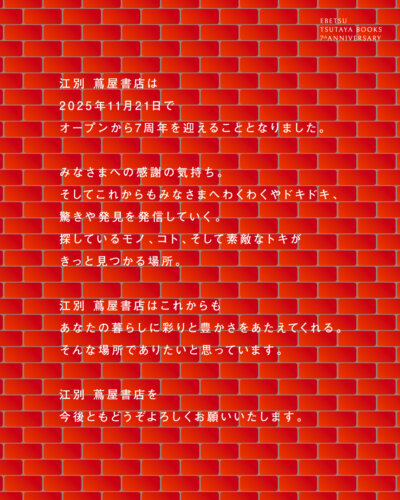 2 0 2 5 年1 1 月2 1 日で、江別 蔦屋書店は7周年を迎えます。ここ、江別の地に産声を上げてはや7年。