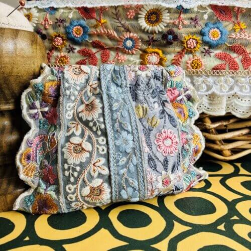 10cmからのカット販売、その場でポーチやショルダーストラップが10cm〜カット可能◎インド刺繍リボン分ほどでできる製作オーダーを行っております。今回は第4弾。