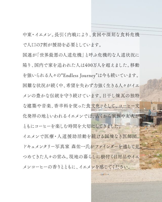 イエメンコーヒーの伝統を守り現地の小規模農家を支援するほか、戦争のイメージばかりでなく大切に守られてきた
